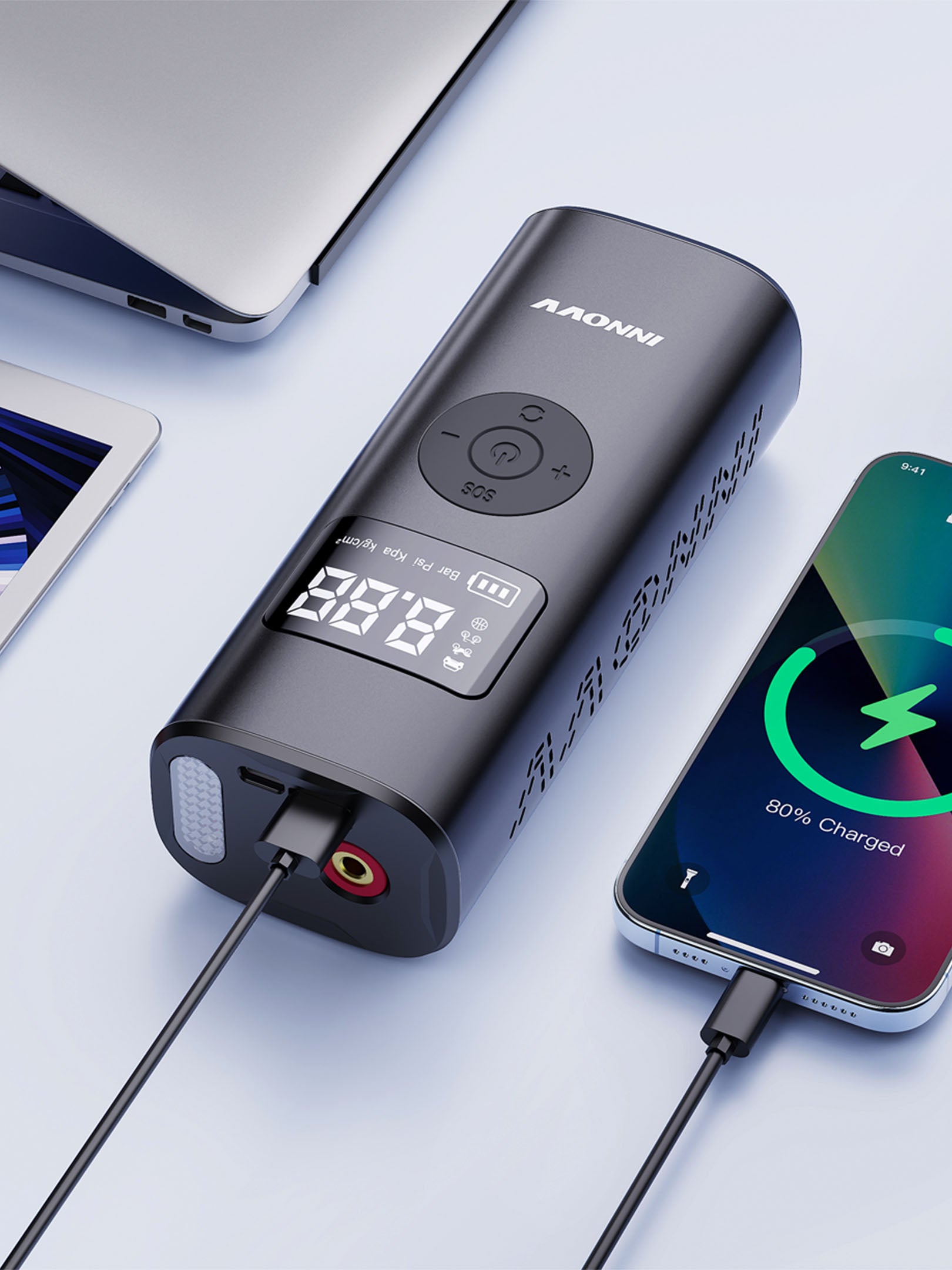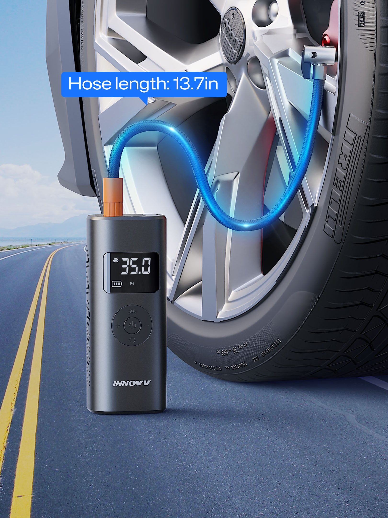 The INNOVV P1 Portable Tire Inflator delivers impressive performance — it can inflate a 235/45 R18 car tire from 28 to 38 PSI in just 1 minute.
